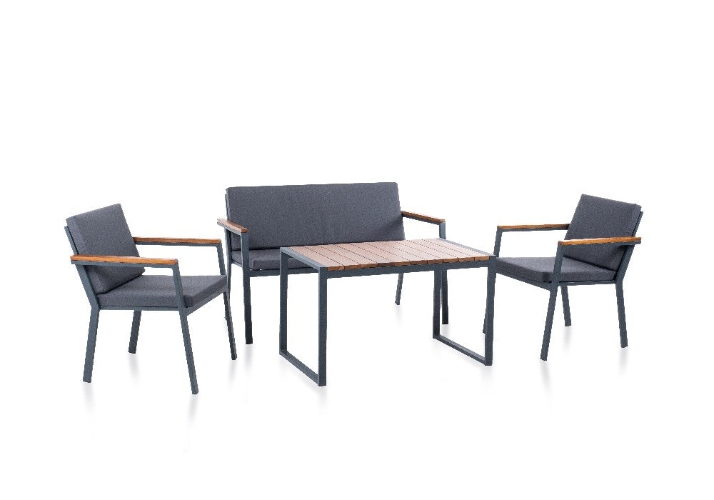 Aspen Loft Ahşap Detaylı Metal Bahçe ve Balkon Oturma Grubu - 4 Kişilik Antrasit Minderli Set